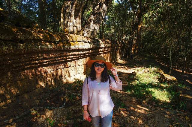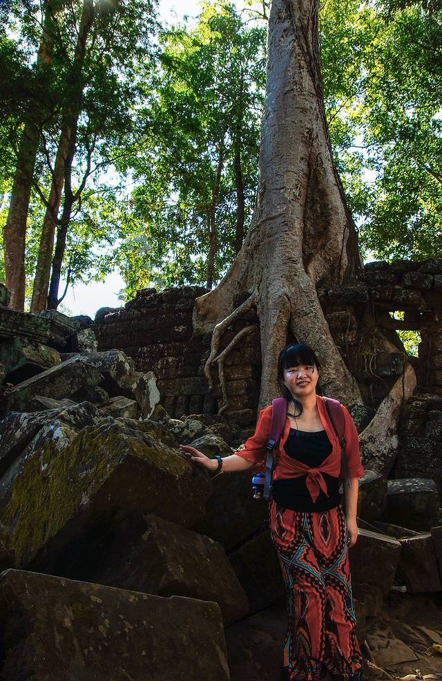 逛到门的另一面有一棵巨大的卡波克树从残垣断壁中拔地而起,没有塔布笼寺的成堆游客,我们可以近距离的抚摸这柬埔寨特有的神奇巨树。