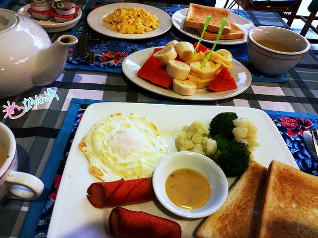 本来打算睡个天昏地暗,没想到8点半就醒了,反正一定要去邮局寄明信片,不如早点起来,中午还能回来休息。于是我们洗漱过后就来到Neth Socheata Hotel自家经营的小餐馆吃饭,入住Hotel早餐是免费的,固定的四款套餐。于是美好的一天便从丰盛的早餐开始,小餐厅不但装潢可爱,而且餐点好吃又便宜。
