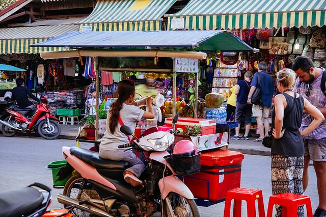 饱餐一顿告别两位妹子,我们按记忆原路返回——因为来时跟着谷歌地图比较赶,因为暹粒的小巷子特别多,晚上人一多完全无法辨认方向——最后还得看地图。不过也因为瞎走偶遇蓝南瓜,干脆奢侈一下买了个三球冰淇淋,椰子味的特别好吃,果味很浓还能吃到椰肉。