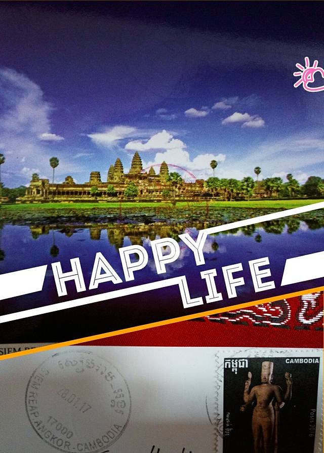 参观完偶遇的寺庙后,我们一路来到邮局,一栋黄色小楼也是暹粒唯一一家邮局。寄往中国的邮票最少是3千瑞尔,是比较一般的,你也可以在邮局买好看的邮票,价格当然更贵。写完明信片贴好邮票交给工作人员就好。我们在写明信片时也看到不少人直接拿明信片来寄的,交了钱工作人员会帮忙贴邮票。在写这篇文章时我已经收到了寄给自己的明信片。