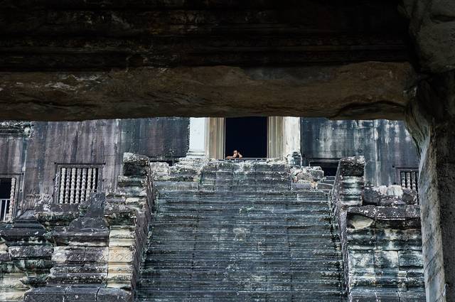 吴哥寺三层是限制人数的,必须挂牌才能上去,我们从二层出来就要开始排队了。即使人们都说日出完进小吴哥参观人并不多,但是上三层我们还是排了将近45分钟——听第三天和我们拼车的姑娘说她们早上8点多去吴哥寺,排队人就很多,她们没上三层。毕竟“爱情梯”就那么一座,四周有几个原先的石梯,不但陡峭而且损毁严重,现在都拦起来了。虽然也有不愿意排队的勇士去挑战,但为了大家生命安全考虑并不推荐。
