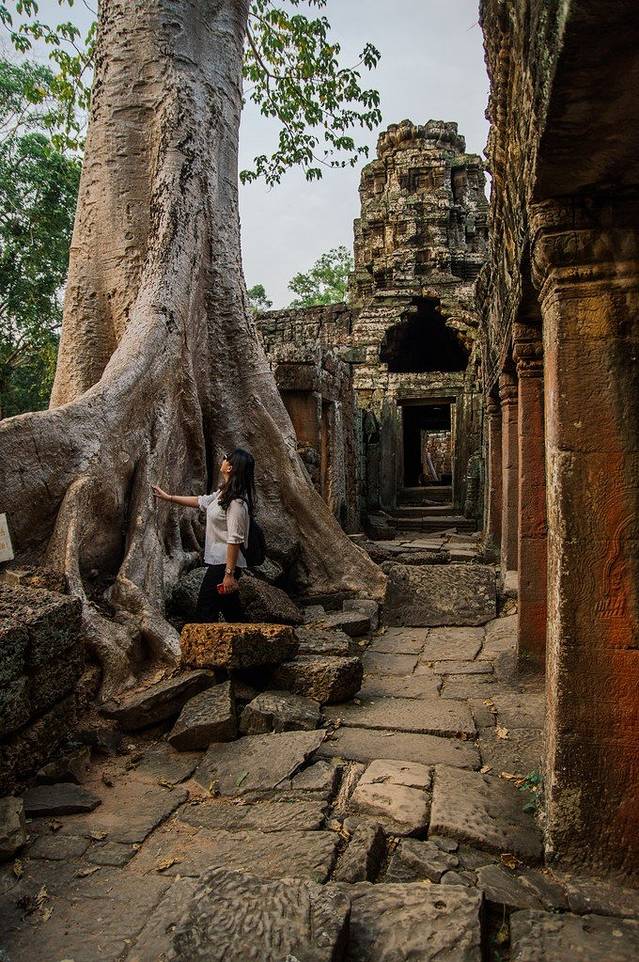 在一大波游客到达的时候我们已经坐上TUTU车按照预定来到塔布笼寺,传说是古墓丽影的取景地而出名,是旅行团必去的点。塔布笼寺是阇耶跋摩七世为自己的母亲修建的佛教寺庙,由印度认养维修。因为树木的破坏寺庙损毁非常严重,而印度的维修队提出“共生”的理念,才使得我们现在能看到这些参天古树包裹着寺庙的奇景。