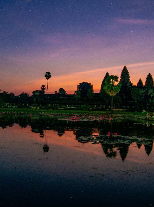 凌晨4点半我们背上脚架出门时(每天都有早早看日出的人,叫醒前台睡觉的小哥开门),司机已经准时在约定的VIVA门口等候了,问候之后便朝着吴哥寺进发。即使这么早也是有工作人员打着手电查票的,漆黑的丛林里只有TUTU车摇曳的灯光。司机中文不错,停车的点也不错——WC,不但好找还能解决三急问题。没手电也没关系,只要跟着光源走就好,到处是打手电的人。一定要抬头看,漫天的星星简直美到炸裂,而且非常闪亮,只是我遗憾的又一次拍星空失败了,最后只留下这张模糊的日出试拍照上留下了点点星光。