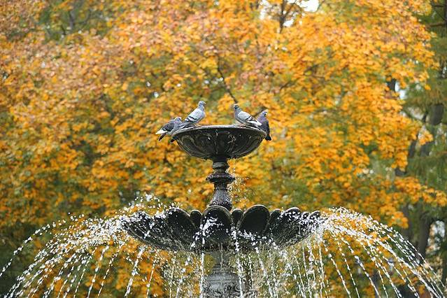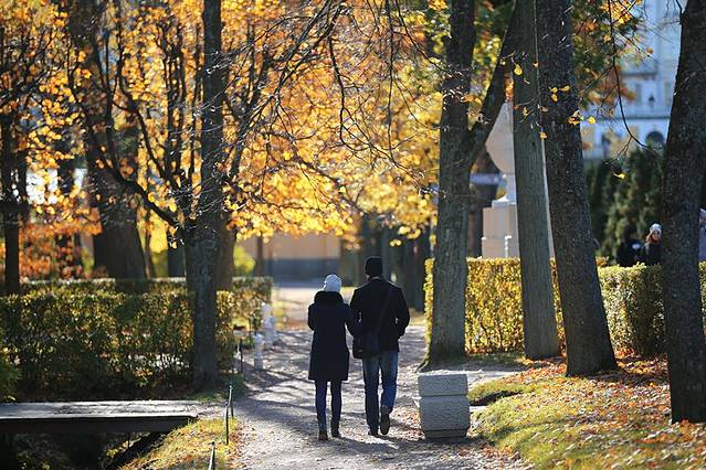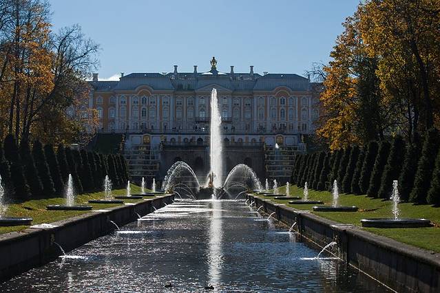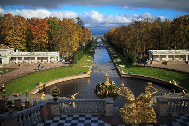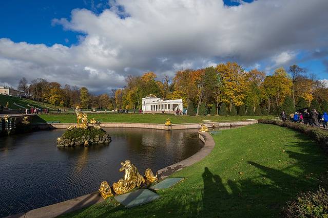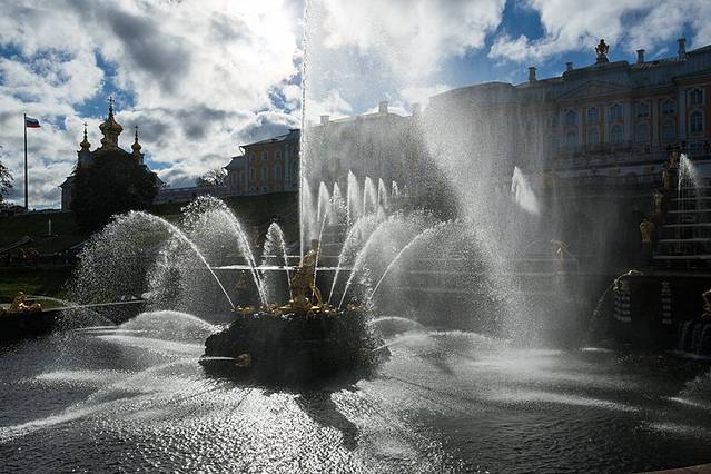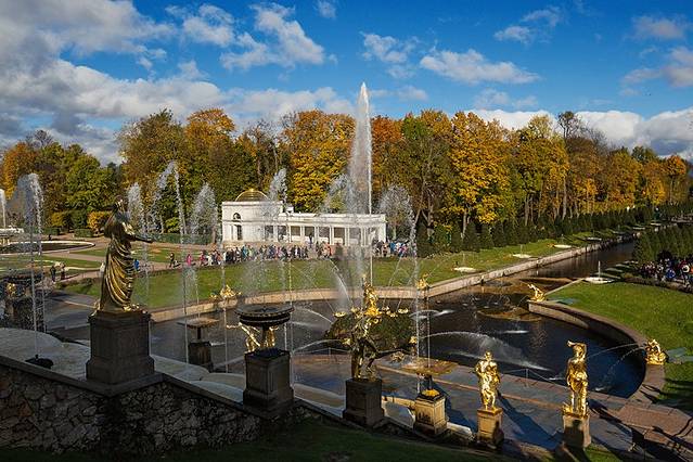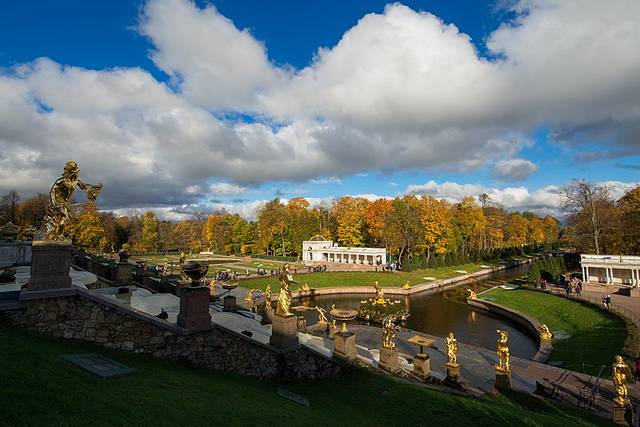 夏宫的喷泉每年的5月到10月下旬开放,每天是11点钟开始喷水。10月已经不是圣彼得堡的旅游旺季,不过想占据看喷泉的有利地形,还是提前去占个位置。这次我终于发现原来除了中国老太太,韩国老太太也特能挤,还把自拍杆伸出老远拍照。我在边上翻了几千个白眼都被无视了。