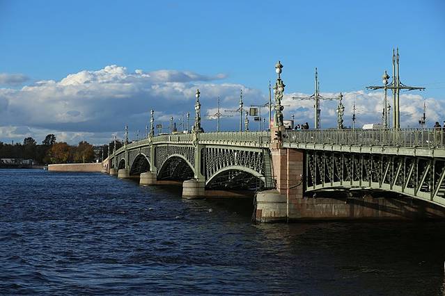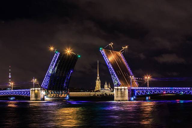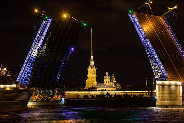涅瓦河的开合桥是圣彼得堡的一个标志。每年4~11月的通航期间,涅瓦河和主要运河上的22座桥就会在夜间打开,让船只得以进出波罗的海。