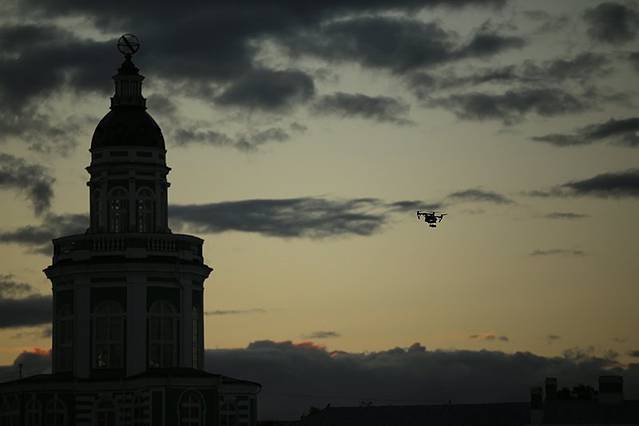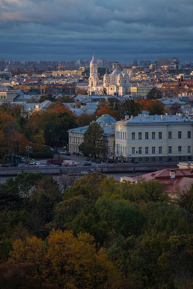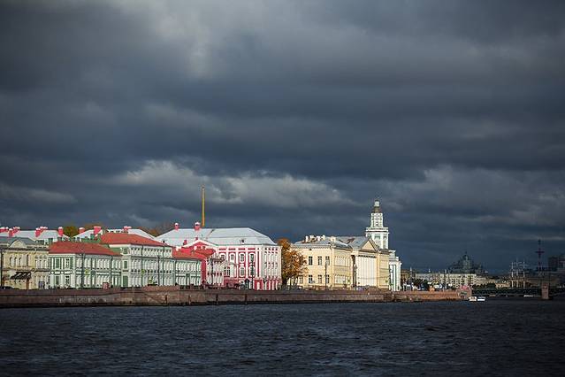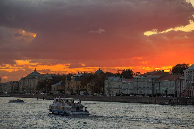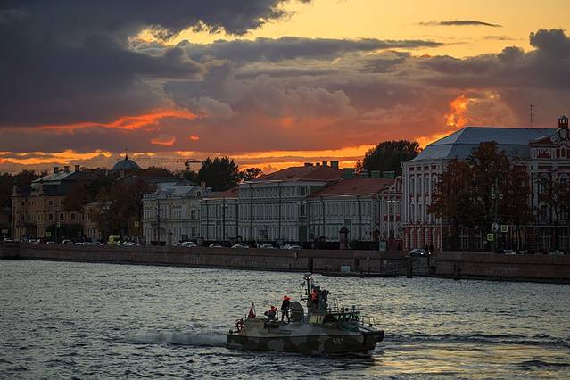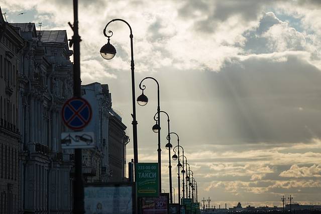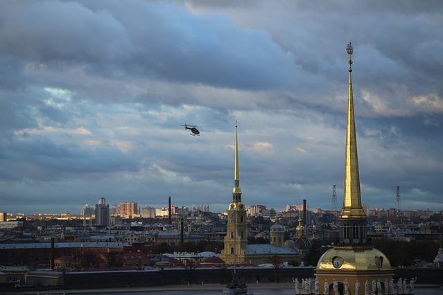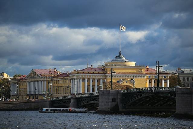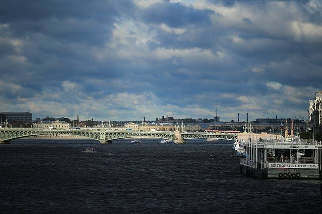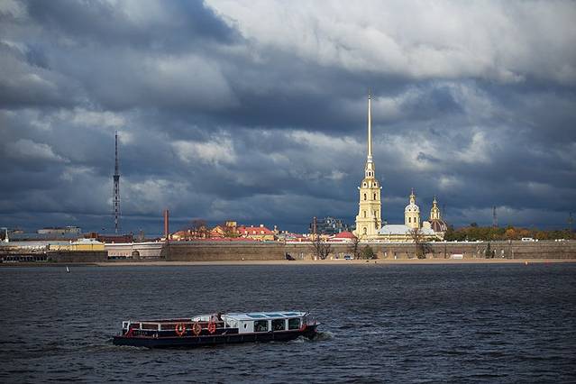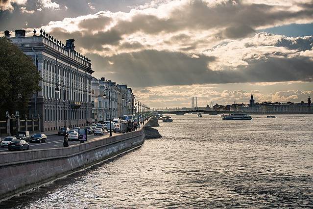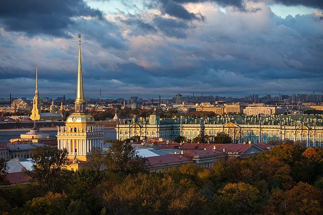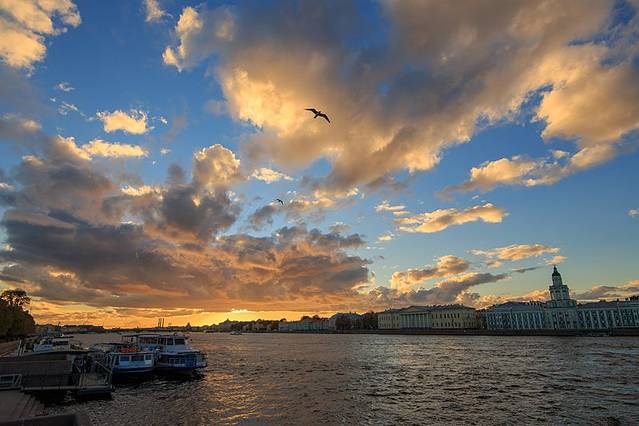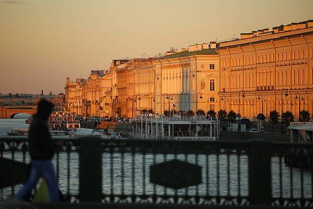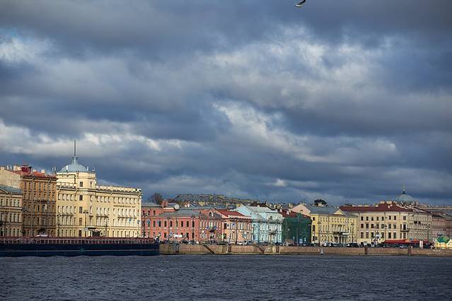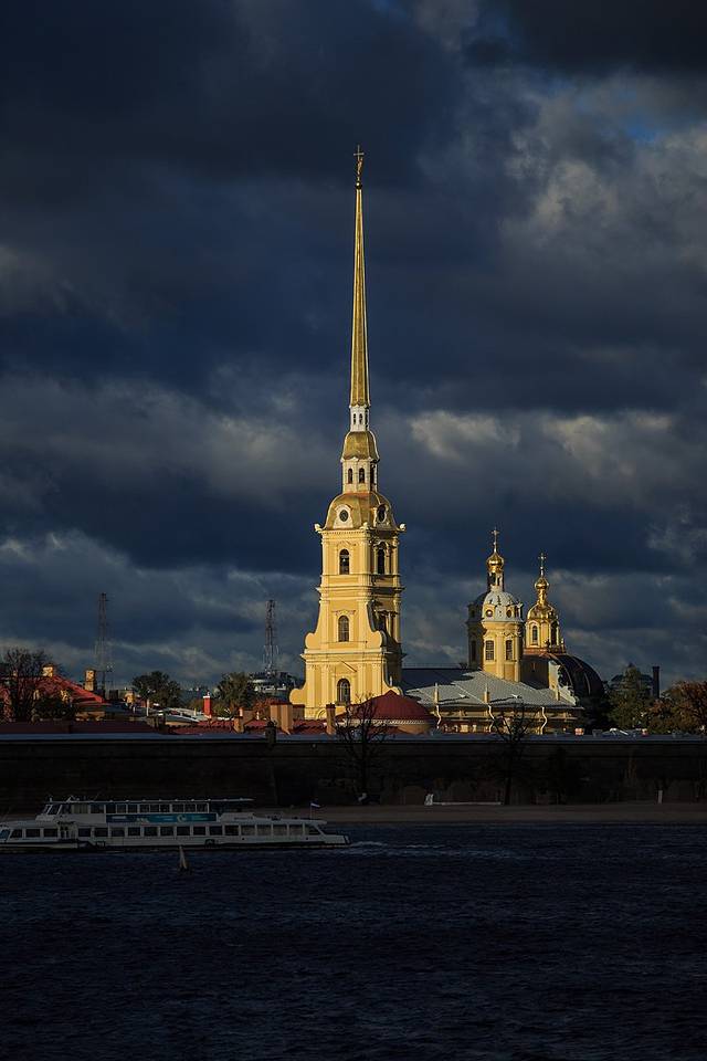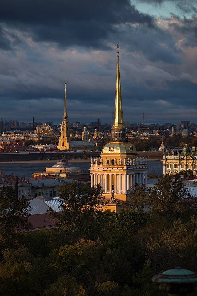 近处的海军总部和远处彼得保罗要塞的金顶在偶尔透过云层的夕阳下照射下反射着耀眼的金光。