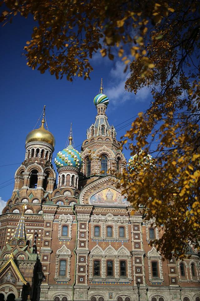 滴血大教堂就在涅瓦大街的一条侧街上。她是沙皇亚历山大三世为了纪念在此遇刺的父亲亚历山大二世所修建的。相比她略显血腥诡异的名字,大教堂的建筑却是相当的美腻。从那几个彩色的洋葱头就能依稀猜到她的建筑风格来自红场上的圣瓦西里大教堂,是中世纪俄罗斯的建筑风格。