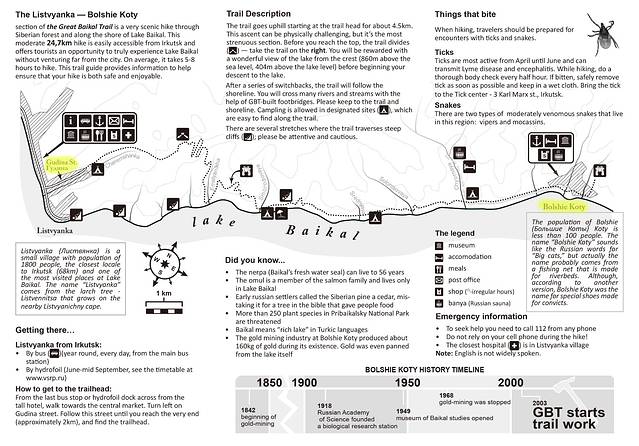 2003年,一小群爱好者开始了一个志愿者项目,修建环贝加尔湖湖岸的徒步路线 ---- 大贝加尔小径(Great Baikal trail)。贝加尔湖环湖一周的距离长达2000公里以上,目前建成的部分有500多公里,虽然离终极目标还遥遥无期,但是这条线路的吸引力已经与日俱增,现在每年都会有志愿者继续参与小径的修建。