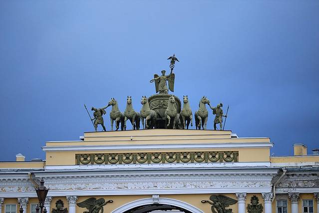 从夏园开始沿着河岸往西,走不多远就能看到一栋绿色为主色调的巴洛克风格建筑。最扎眼的是楼顶上一溜儿雕塑,形态各异不带重样儿的。当时还想这是谁家啊那么阔气,后来才发现原来这就是大名鼎鼎的冬宫了。