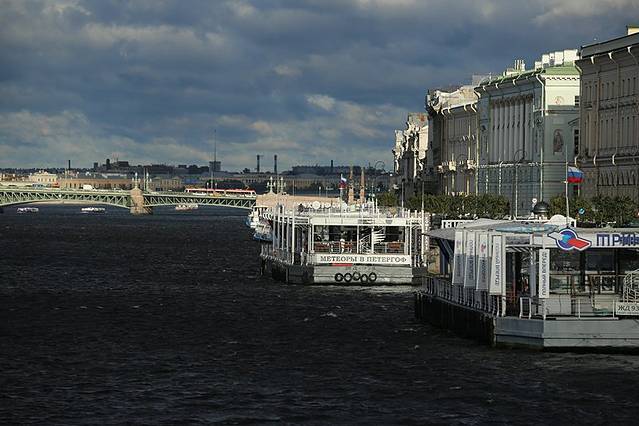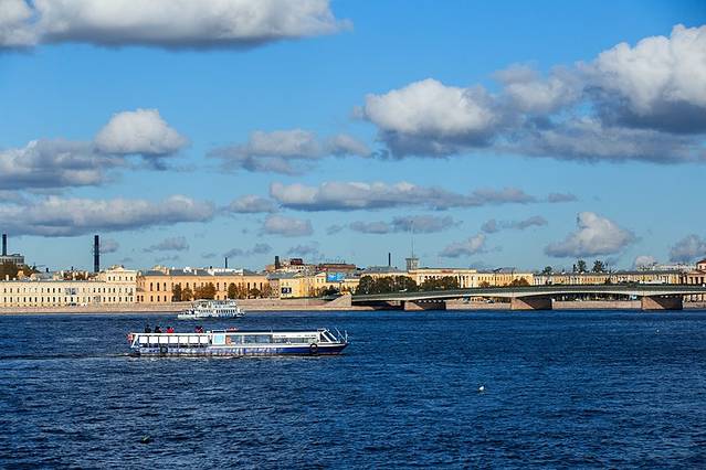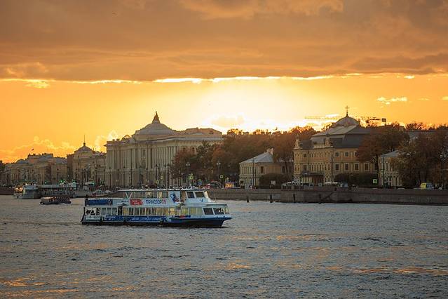 穿过夏园,一道宽阔的河流横亘在眼前,这就是涅瓦河。第一眼的涅瓦河是惊艳的,河水蓝的不太真实,河两岸以黄色和红色为主色调的建筑与河水形成了优美的互补色。宽阔的河面上不时有游船来回地游走,那些横跨两岸的精美桥梁少说也有100多年的历史。老章经不住要哼起那首一条大河波浪宽来。