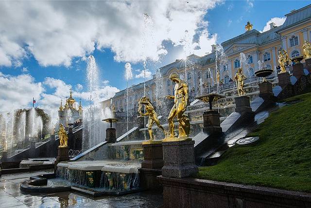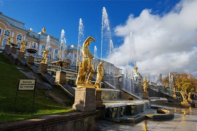 滚犊子,答案是宫殿,花园和喷泉。尤其是喷泉,夏宫有“喷泉之都”的美称,它有百余座雕像,150座喷泉,2000多个喷柱及两座梯形瀑布。尤其是大宫殿前的大瀑布喷泉群,由上至下分多级台阶。喷泉群的中央,耸立着大力士参孙和狮子相搏的雕像。这一雕塑象征着俄罗斯战胜瑞典。