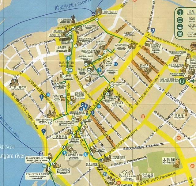 伊尔库茨克有一条步行游览的绿线,不光是在地图上,甚至在沿线的地面上也漆上了绿线,这是有多贴心。这条线囊括了市内主要的历史建筑,你可以对着地图按图索骥。不过为毛我的注意力都在人(mei)文(nv)景观上呢。