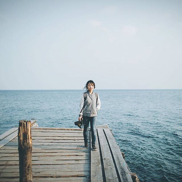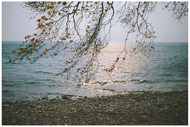 尚未褪去的雾霾淹没了对岸的景色,却模糊了天空和湖水的界限,只剩这一汪浓浓的蓝色。