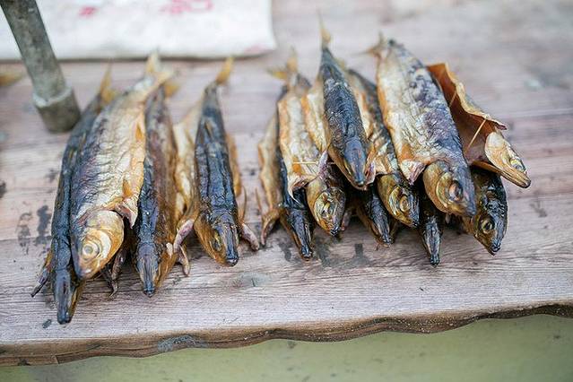 Omul鱼是贝加尔湖的特产,最通常的做法就是烤鱼,都是最原始的方式,用树枝来烤。所以烤出来的鱼带着木头的特殊香味,也让小镇的空气里溢满了木炭的烟熏味道。烤鱼按照大小一般是100,150和200卢布三种。