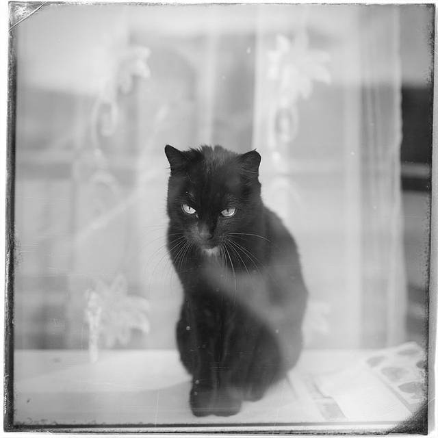 窗台上的这只小黑猫谨慎地注视着我们的一举一动。