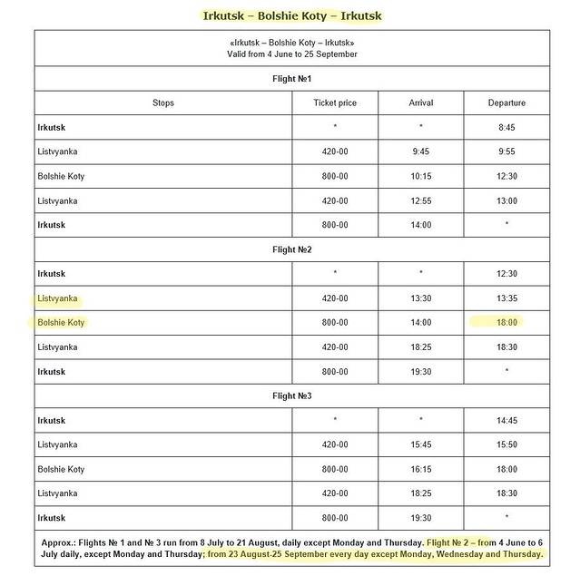 注意涂成黄色的部分,第一行的黄色部分说明这条渡轮是从伊尔库茨克出发,到利斯特维扬卡,再到Bolshie Koty的,第二行涂黄色的标识了发船时间,可以看到一天有两班船从Bolshie Koty出发,先到利斯特维扬卡,再回到伊尔库茨克,第二班船的开船时间是6点,白字黑字的6点啊,可特么真的5点半就出发了,所以宁早勿赶,到时候想评理也没人听得懂。最后,也是最下面一行写着不同季节的发船对应时间,从表上看似乎过了9月25号就没有这般渡轮了,至少表上是这么写的,最好和当地的information centre确认下。