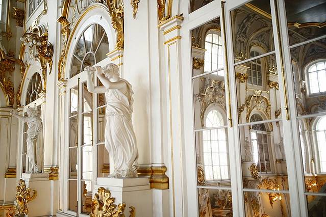 但其实叶宫并不是叶卡捷琳娜二世造的,叶宫是彼得大帝为了他抢来的老婆叶卡捷琳娜.阿列克谢耶芙娜,或者叫叶卡捷琳娜一世建造的。不过当时估计只是一座土不拉几的庄园,他的第二人主人伊丽莎白女皇扩建了其建筑部分。然后第三任主人叶大帝将原来呈几何形布局的花园改建成时髦的英国式园林。这才有了现在叶宫的模样。是不是有点乱,嗯,老章也有点乱。