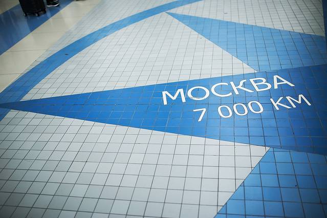机场地面上的标识显示从这里到莫斯科的距离是7000公里。这应该是说的直线距离,如果坐西伯利亚大铁路横穿俄罗斯到达莫斯科的话,总的距离是9332公里。