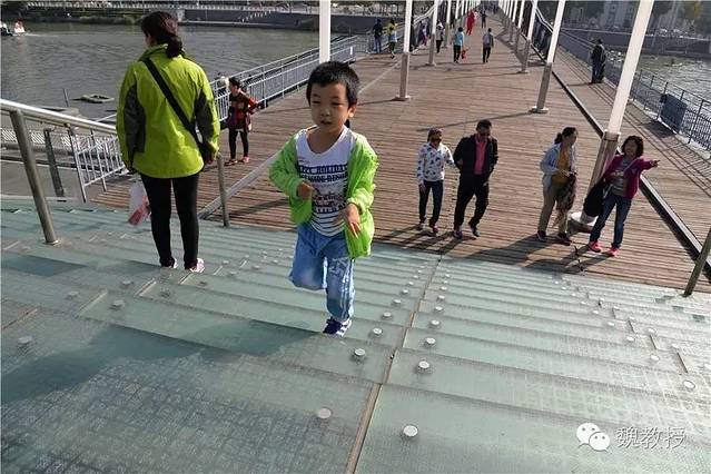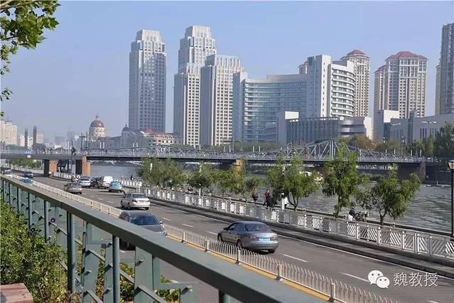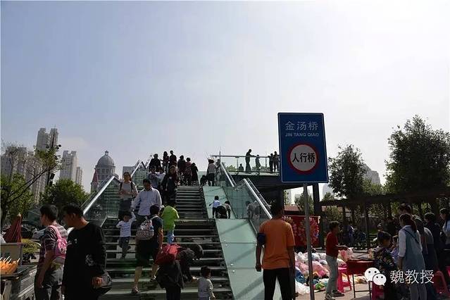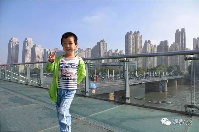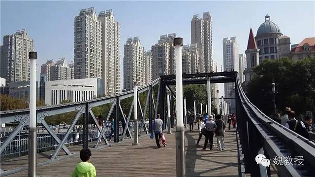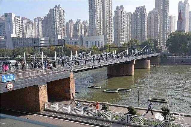 我带魏小宝往天后宫走,看到金汤桥。桥名是“固若金汤”的意思,建于1906年(光绪三十二年),是为了有轨电车通行而建的,是天津市现存最早建造的大型铁桥之一,也是天津解放的标志。桥长76.4米,总宽10.5米。桥头现在是玻璃台阶,之前没有见过用玻璃当台阶的。