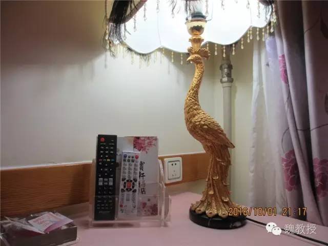 桌子上摆的台灯是金孔雀形状,很精致漂亮。
