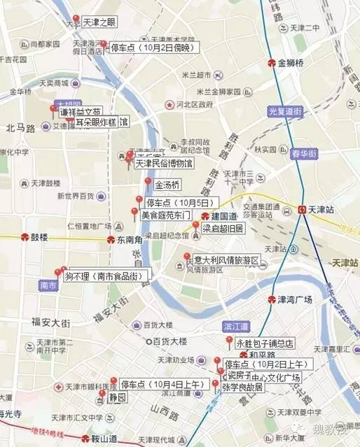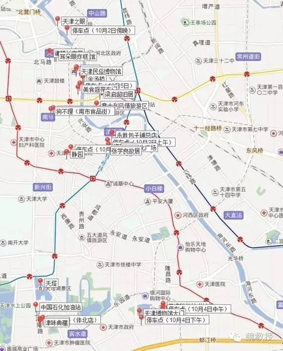 这是我们实际在天津到过点的标记,最为密集的那些点在图上方,就是五大道附近,离宝轩酒店大约5-10公里,每次出门,都必须开车,停车成为很大问题。理论上说,这次选择不是最优方案。这是之后的总结发现的,我在想,下次打算去某地,就应该先在地图上标记好景点,然后在标记点密集的附近选择。