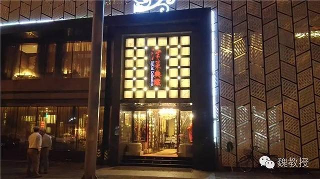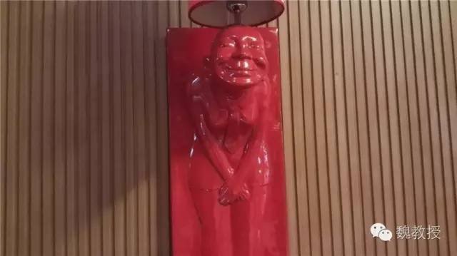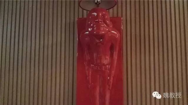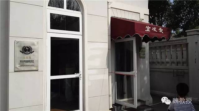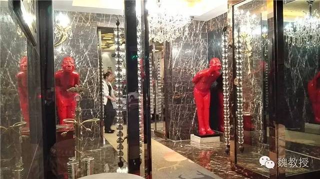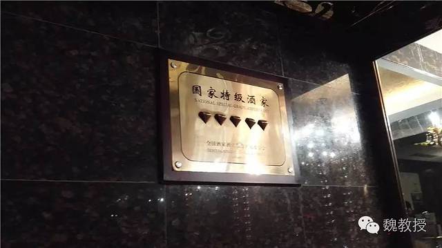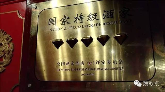 门厅看着珠光宝气的,一男一女两个红色老人雕塑弯腰伺候着(上图)。国家特级酒家的标牌上的五钻格外显眼(下图)。