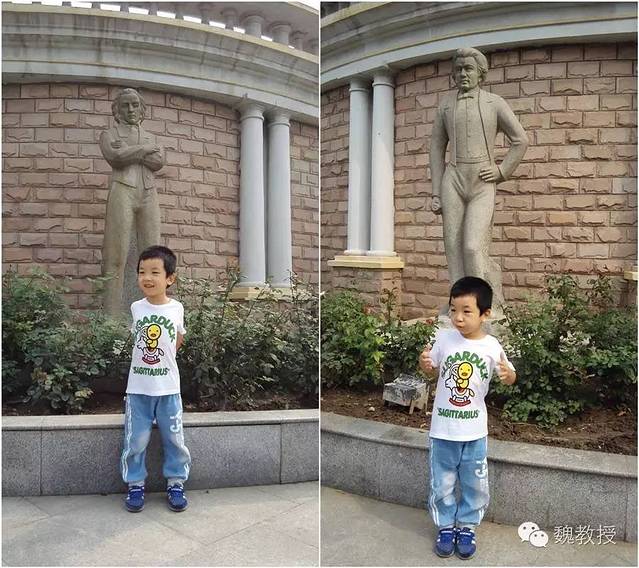 中心文化广场有一面音乐墙,魏小宝学钢琴已经一年半了,对此非常感兴趣,主动跟自己喜爱的音乐家的雕像合影。
