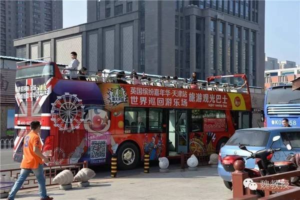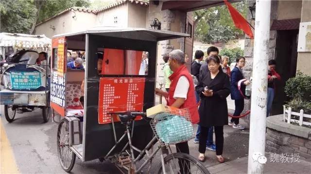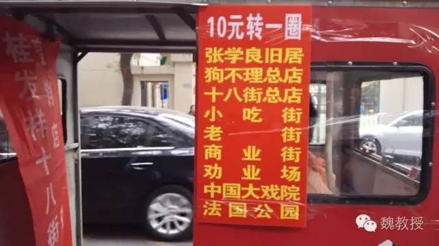 10月4日10:45,我们从静园出来,就在门口,看到有电动三轮车,上面写着附近景点的名称:张学良旧居、狗不理总店、十八街总店、老街、商业街、劝业场、中国大戏院、法国公园,每人10元,到法国公园下车。