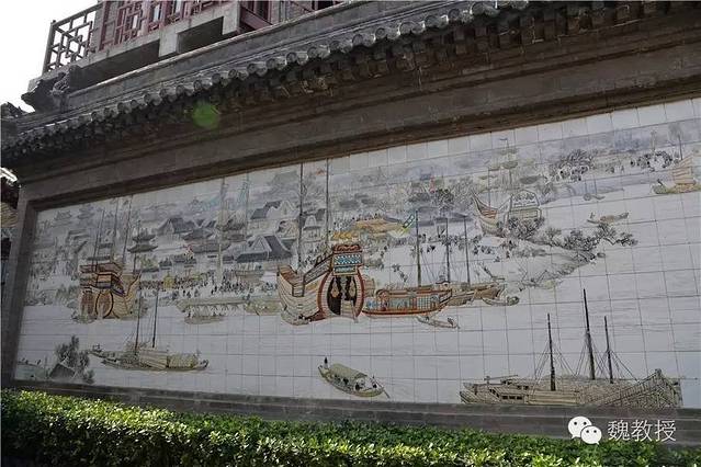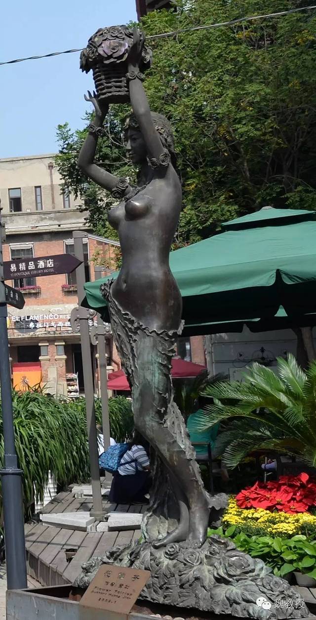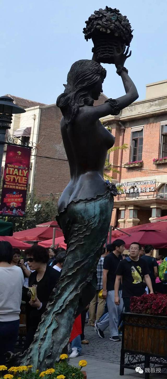 我们没有从津门故里牌坊往里面走,而是从南边的广场进去,这里有尊巨大的妈祖塑像,广场上每棵树的下面都做成船型。
