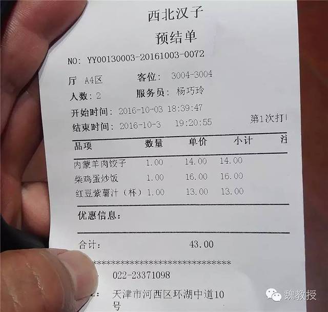 18:28到酒店,我们到酒店对面的西北汉子吃蛋炒饭和饺子,中午没有吃饭,这会儿18:44才吃上嘴,魏小宝估计是体会到饿的感觉了。