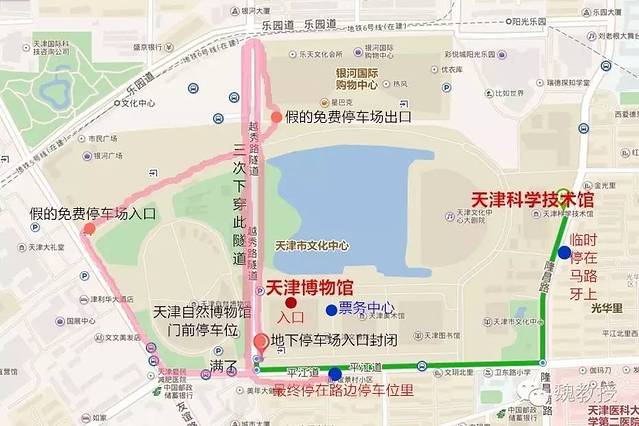 好在穿过去就可以调头再下穿隧道回来,右转,想在天津自然博物馆门口找停车位,但是开车到近前,才发现停车位已经满了,只好继续往前开右转,看到一处地下停车场入口。