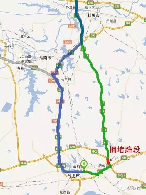 出发之前不断在百度地图上看,东边高速公路一直都是红色,就是京台高速和合肥绕城共用的那部分严重堵塞,所以决定从西边的蜀山西上高速,就是左侧蓝色线路,这个线路只是多跑了5-10公里而已。