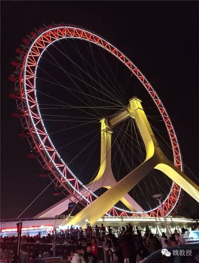 下车来拍几张照片,一边往天津之眼方向走,很多人排队买票,等我走到近前,看到滚动字幕说,今天票已经卖完了。天津之眼2009年4月开放参观,摩天轮直径110米,轮外装挂48个透明座舱,每个座舱可乘坐8个人,旋转一周需要28分钟,离远了看,都看不到它在转动。这么多人排队买票,应该转快一些。