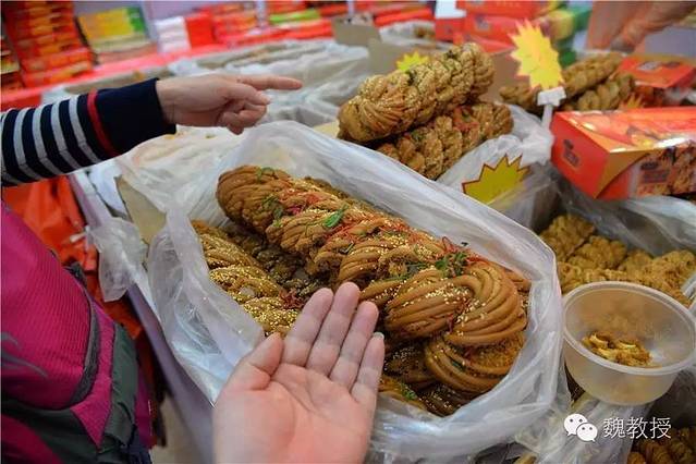 麻花品种很多,其中最大的据说有8种口味,我用手比较一下大小,拍了一张照片。想着我们的朋友@破茧幻化成蝶 说过家里人爱吃麻花,我们就买了一根最大的带回去送她。