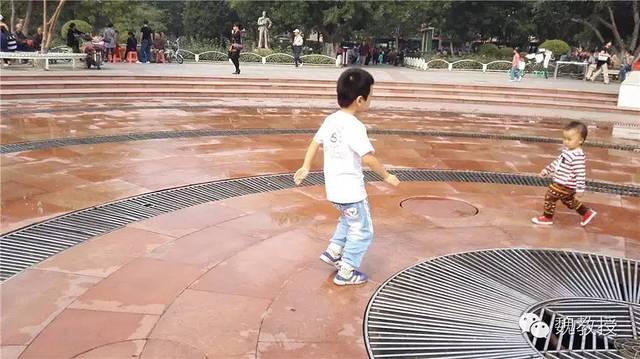 在“饮冰室”的门口,我把相机架在花坛上,自拍一家三口合影,大家注意喷泉和魏小宝的动作,前一张喷泉没有水,这张喷泉有水。原来是后面有一个开关,魏小宝用开关控制喷泉,玩了好久。