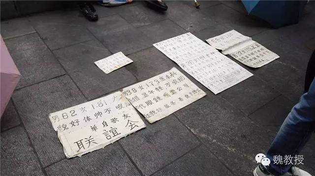 很多老人坐成一排,地上放着子女的条件征婚。