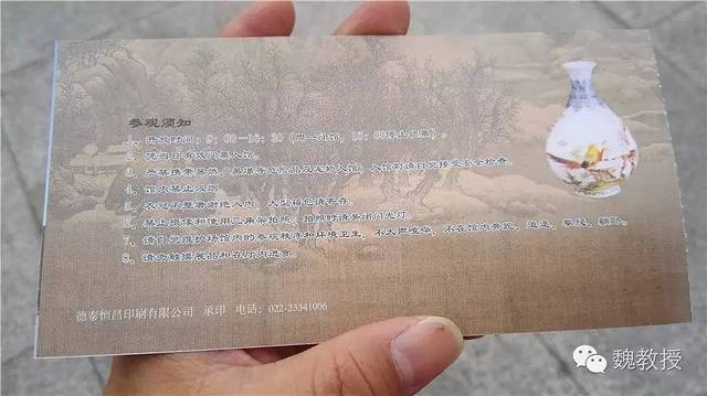 天津博物馆门票背面印刷的是一个瓶子,这个瓶子叫做珐琅彩芍药雉鸡玉壶春瓶。这样的瓷瓶在当时制作了几个,乾隆将这件保留下来,其余的砸碎,所以与这件瓷瓶完全相同的已经不存在了。