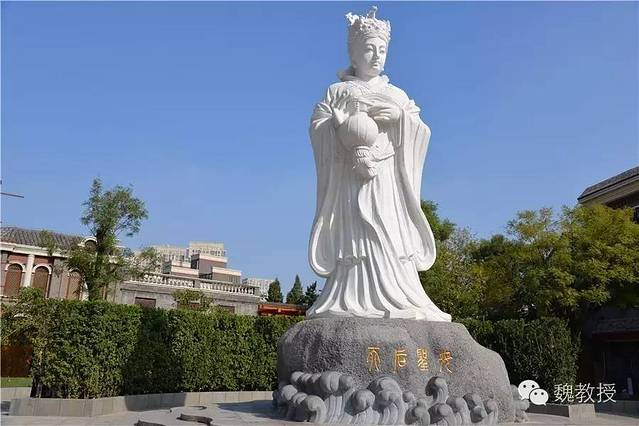 妈祖塑像纯白色,下面写这“天后圣母”4个字。妈祖,人物原型是生长在大海边的林默,通晓天文气象,熟习水性,在湄洲岛与大陆之间海峡里遇难的渔舟、商船,常得到林默的救助,她还会测吉凶,会事前告知船户可否出航,练就一身好水性,又能驾船如飞,自愿担起海上救援任务,哪里有呼救,那里就出现海上女侠的身影,经她救起的渔民无数。987年(宋太宗雍熙四年)的一次海上救援中,28岁的女侠不幸遇难……乡亲们更愿意相信林默羽化升天,成了海神——妈祖,永远护佑他们平安顺利。千百年来,从莆田到福建,到中国沿海,再到海外,从宋朝到大清,历朝皇帝36次褒封她,28个国家和地区6000多座庙宇供奉着她!