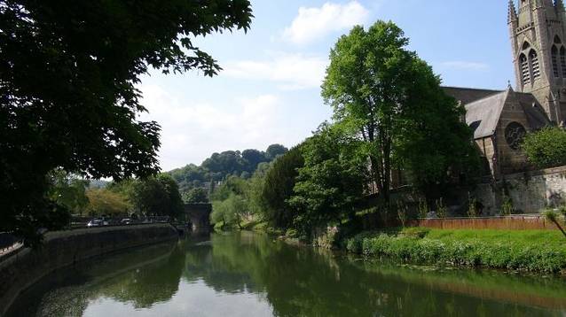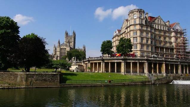 这条河叫做埃文河(RIVER AVON), 与我们在布里斯托尔看到的是同一条河。埃文河从东面和南面包围着巴斯小城,就如同母亲伸出两条臂膀把可爱的巴斯小城紧紧的拥在自己的怀抱里。正是由于有了这条河,让这个被丘陵围绕的古典优雅小城多了许多的灵动和秀美。傅雷曾经赞美巴斯是"精致而美丽的城市"。我之所以把它称为小城,因为这个城市的确不大,人口大约9万,老城区里的所有景点步行都可以到达。