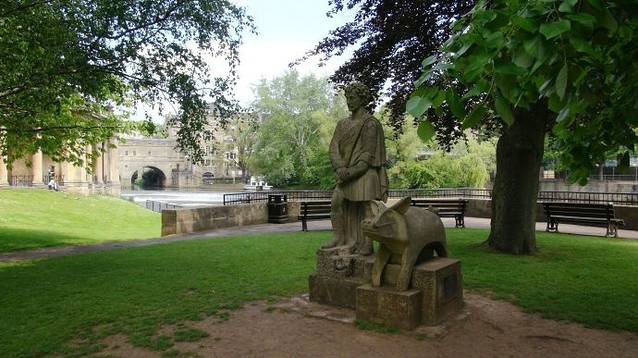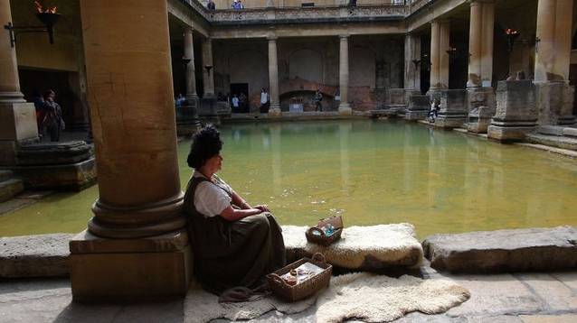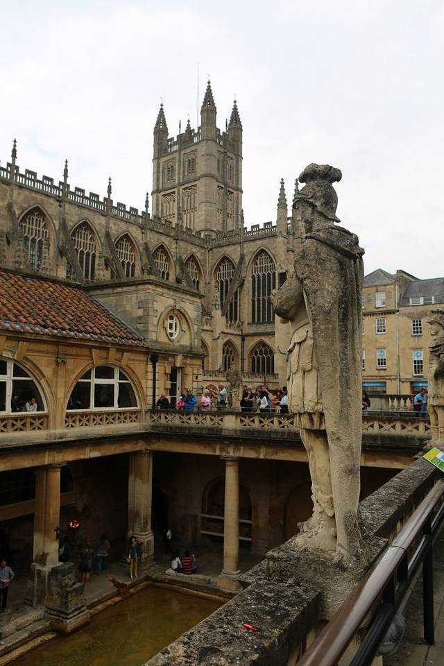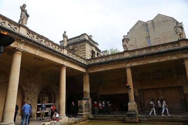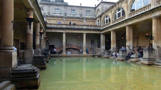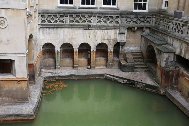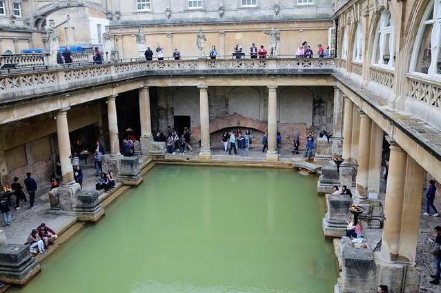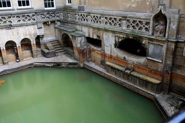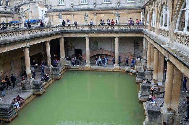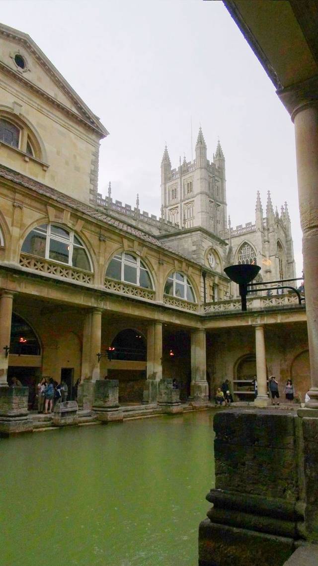 这里原本是古罗马贵族的温泉疗养地,后来随着罗马人的撤退而逐步衰落。现存的古罗马浴场(The Roman Baths)温泉遗址是欧洲屈指可数的著名古代遗迹。在18世纪发掘并复原。直到今天,这里的温泉口依然源源不断的涌出恒温46度的温泉水。最后温泉水流入了我们曾经多次看到过的埃文河。