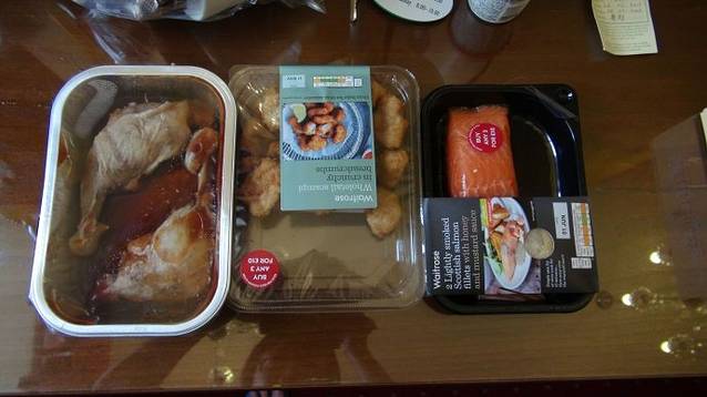 这是我们在那个超市买的三盒食品:两只酱鸭腿,一盒炸鸡块,一大块生的三文鱼,10英镑。挺超值的。在超市的门口,我们遇到了一位老人,他也去过中国的香港,是他推荐我们去那个大型超市去买食品的,我们聊的很开心。更让我们开心的是,他竟然夸我们的英语听力不错,理由是居然能听得懂他说的英语。呵呵。这位英国老头实在是太会聊天了。有意思。
