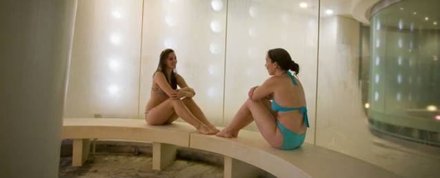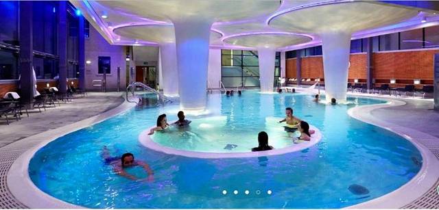 (网络图片)换好泳衣,先去了位于底层的大泳池。先说为什么都是网络图片吧。其实去从北京出发的时候就开始筹划怎么在这里照相的事,因为早就知道这里不让带相机拍照。我还特意买了手机防水套。结果手机也是带不进去的。防水套也白买了。呵呵。为了满足朋友们的好奇心,只能选用THERMAE BATH SPA官网上的图片了。很抱歉。这个池子了当然是温泉水,刚下去的时候感觉有点热,不过慢慢就适应了。水深大概齐胸吧,可以游泳。有一个有趣的事情从图片上看不到,那就是在池子的侧面是有出口的。泉水不断从侧面的喷头里喷出,所以如果你把自己飘在水面上,旋转的水流会推着你在池子里转。挺好玩的。