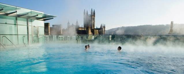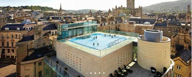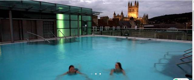 (网络图片)既然有那么好的温泉水,那么如果你有机会来到巴斯最不能错过的一个体验就是像当年的罗马贵族一样,好好的享受一下这里恒温46度的天然温泉。在巴斯有这样的地方吗,当然有,就在古罗马浴场西侧不远的地方。叫做THERMAE BATH SPA 。巴斯城里唯一可以享受天然温泉的地方。(在巴斯还有一些其他的号称可以泡温泉的酒店和度假村,其实真正可以享受天然温泉的只有这一处。)这里的天然温泉来自地下2公里深的泉眼,而且已经源源流淌了上千年。在这里泡温泉还有一个比当年的罗马贵族更享受的地方是,这里有一个楼顶温泉浴池。一边享受温泉,一边欣赏美景,可是当年罗马贵族们做不到的。