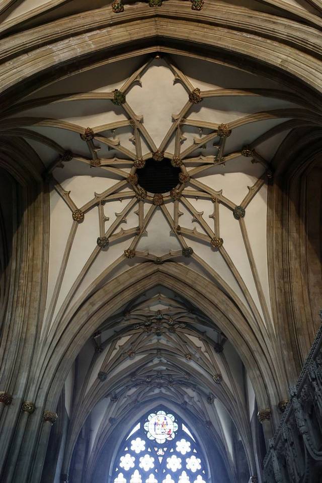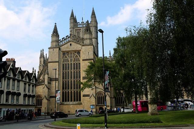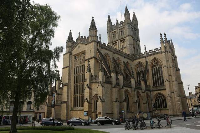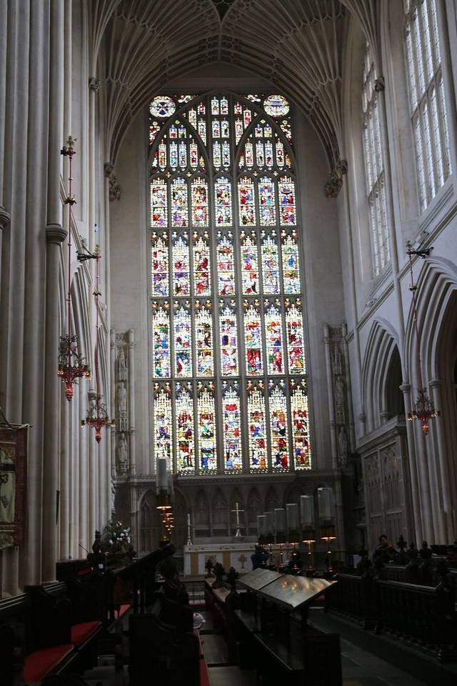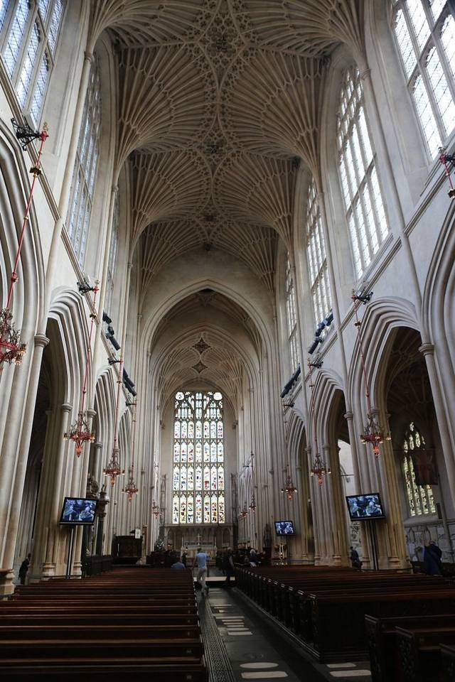 Bath Abbey 以其雄伟的彩色玻璃及扇形的天花板闻名,因窗户多而得名"西方明灯"。