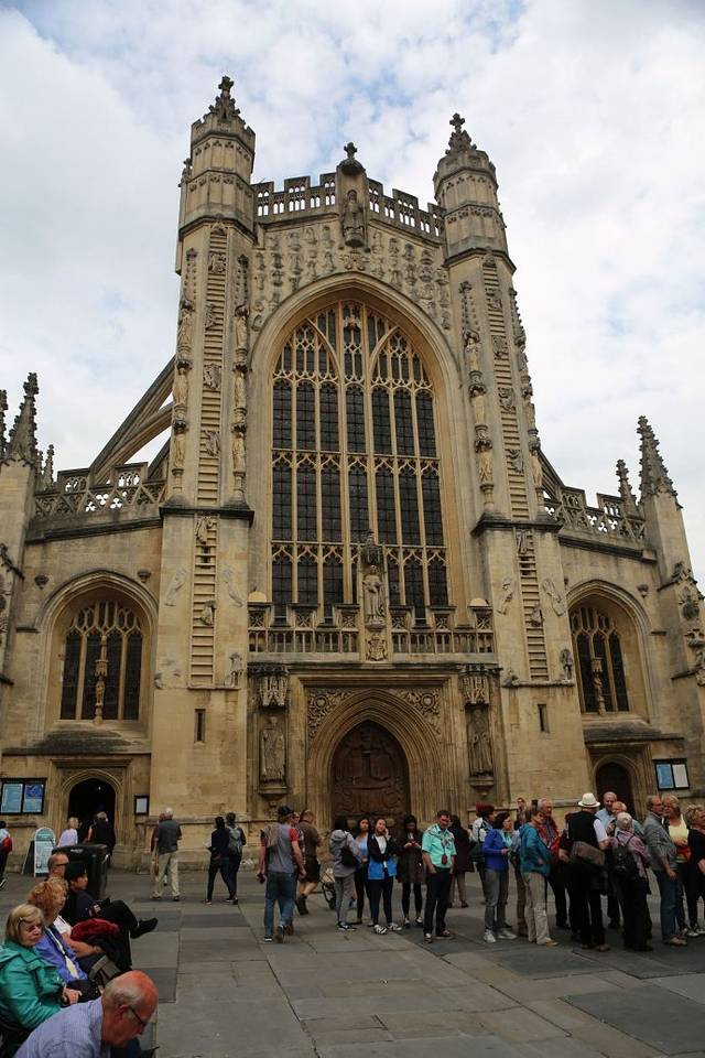 离开了埃文河畔,我们去参观巴斯最著名的巴斯修道院 Bath Abbey. 这个教堂规模宏大,长度67米,宽度22米, 中殿高度24米,钟塔高度49米。