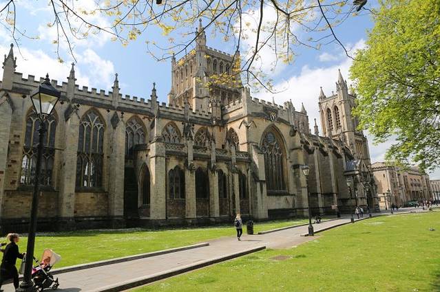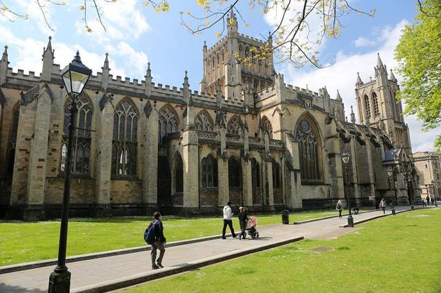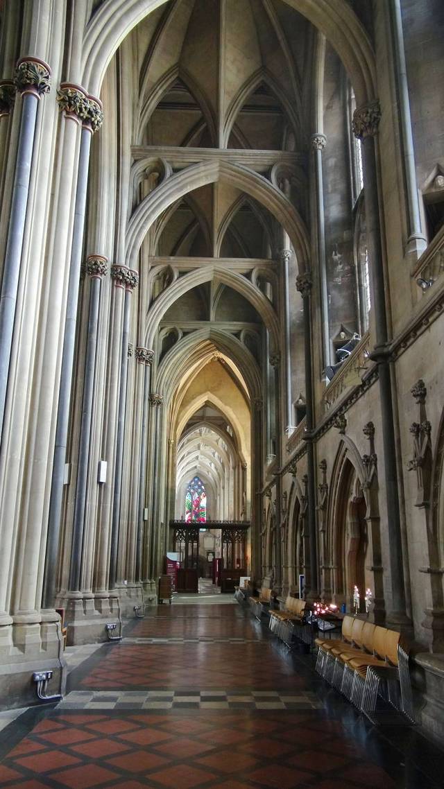 图片上的建筑就是著名的布里斯托尔大教堂。在英国,几乎每个城市里都有一个甚至数个教堂。布里斯托尔大教堂是诺曼时代建立的古老教堂,哥特式的建筑风格,最早是圣奥古斯丁修道院,在16世纪和19世纪进行过大规模修复重建。有鲁滨孙原型赛尔柯克捐赠的大洋烛。