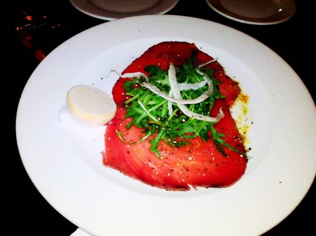 我们老两口特别喜欢海鲜,根据服务员的推荐,我们选了三道海鲜的菜肴。金枪鱼是意大利人特别喜欢的一种高级食材,有一道意大利凯撒金枪鱼沙拉中国人很熟悉,意大利人还用金枪鱼烹饪意面。但我们的这个金枪鱼可是生的。很大很薄的一大片金枪鱼片,加上芝麻菜,小茴香,胡椒,柠檬还用我们叫不出名字的意大利调料,真的非常美味。