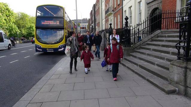 特别让我们郁闷的是,已经过了站牌上的时间了,我们要等的44路车就是迟迟不见身影。又过了大约20分钟,一个当地人不慌不忙也来到车站等44路。我告诉她已经很久没有车了。不知道发生了什么。圣斯蒂芬绿地站不是44的终点站,44路的始发站在我们昨天去过的奥康奈尔大街上,猜想是早高峰时间都柏林也堵车吧。那个当地人拿出手机,指着手机屏幕告诉我们,快来了。我已经看到了。原来这个当地人是在手机的APP上掐着点来等车的。所以如果你有免费的WIFI 流量,不妨也下载一个软件,就不会像我们一样瞎等了。