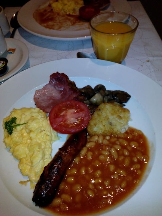 之前我们一直住可以自己做饭的公寓酒店,在这家酒店,我们第一次品尝到了来到英国之后的第一顿正规的英式早餐。英式早餐是英国饮食文化的重要部分。不同于欧陆早餐面包加咖啡的简单搭配,英式早餐以菜点丰富著名。