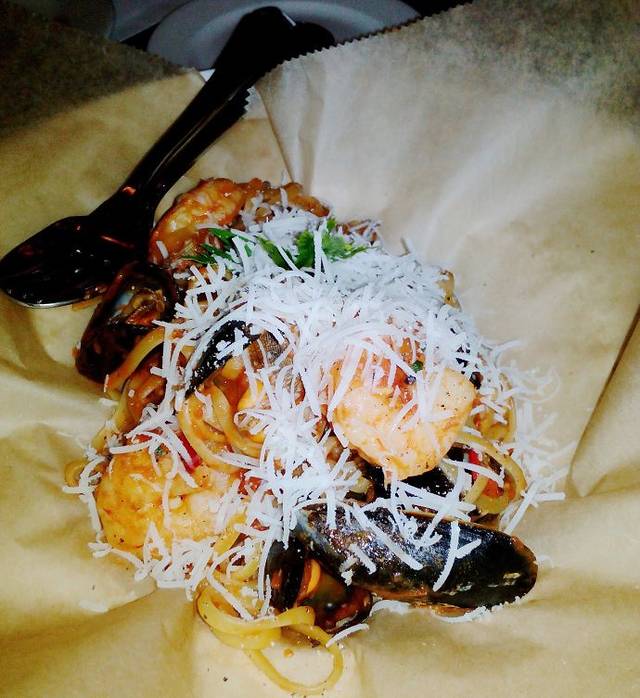 海鲜意面几乎是所以意大利餐厅的经典,我们在伦敦时曾经吃过一家非常棒的意面。但这里的灰皮诺白葡萄酒,非常新鲜的混合海鲜,加入新鲜的西红柿汁,新鲜的辣椒和意大利长面,还有我们又点了一大杯新鲜的扎啤。真的是人间的享受。
